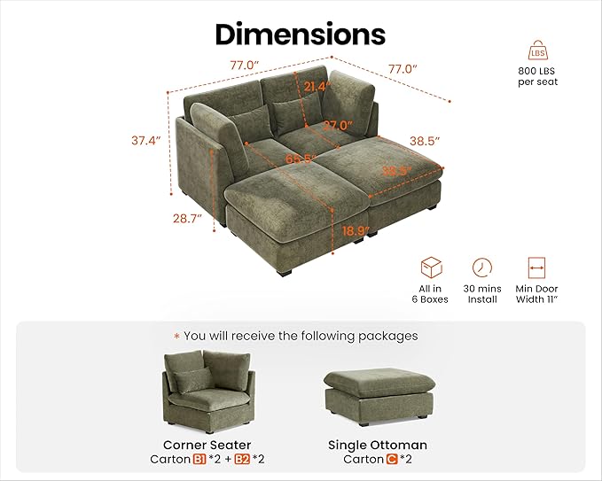 - 【Shipped in Six Packages for Easy Setup】To enhance your convenience, the sectional will be delivered in six packages, allowing for easier handling and assembly. Each package is carefully packed to ensure safety during transit, and while they may arrive at different days, rest assured that our professional customer service is ready to assist you with any concern. The thoughtful design makes the setup process simpler and more efficient,ensuring you enjoy your sectional without any hassle