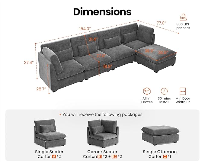 - 【Shipped in Seven Packages for Easy Setup】To enhance your convenience, the sectional will be delivered in seven packages, allowing for easier handling and assembly. Each package is carefully packed to ensure safety during transit, and while they may arrive at different days, rest assured that our professional customer service is ready to assist you with any concern. The thoughtful design makes the setup process simpler and more efficient,ensuring you enjoy your sectional without any hassle