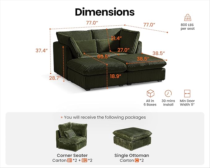 - 【Shipped in Six Packages for Easy Setup】To enhance your convenience, the sectional will be delivered in six packages, allowing for easier handling and assembly. Each package is carefully packed to ensure safety during transit, and while they may arrive at different days, rest assured that our professional customer service is ready to assist you with any concern. The thoughtful design makes the setup process simpler and more efficient,ensuring you enjoy your sectional without any hassle