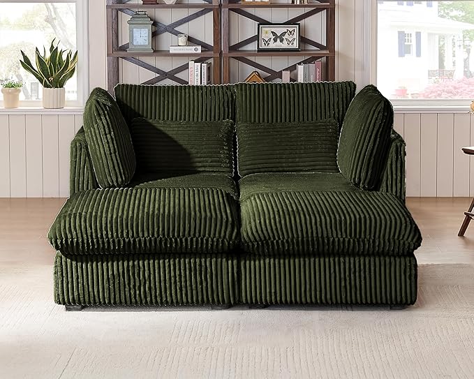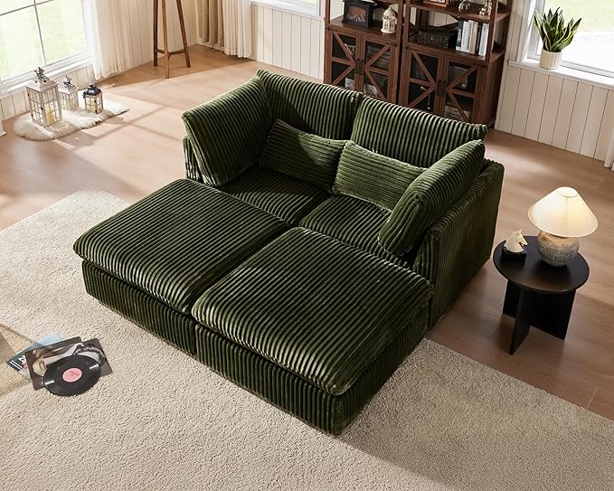 Oversized Modular Sofa, Extra Deep Cloud Corduroy Sectional Couch with Ottoman Chaise, Fluffy Corduroy 4 Seater Couch Bed for Living Room, Villa (Sofa Bed 4 Seater, Corduroy Green)