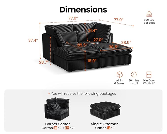 - 【Shipped in Six Packages for Easy Setup】To enhance your convenience, the sectional will be delivered in six packages, allowing for easier handling and assembly. Each package is carefully packed to ensure safety during transit, and while they may arrive at different days, rest assured that our professional customer service is ready to assist you with any concern. The thoughtful design makes the setup process simpler and more efficient,ensuring you enjoy your sectional without any hassle
