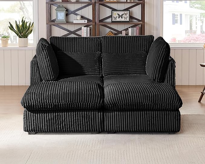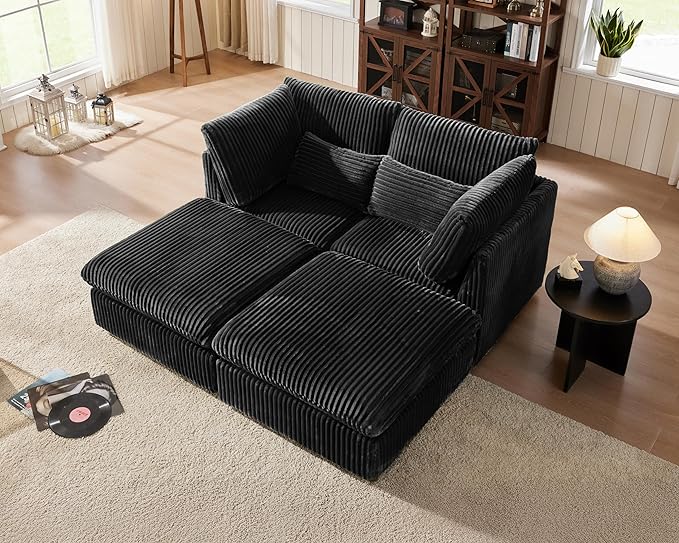 Oversized Modular Sofa, Extra Deep Cloud Corduroy Sectional Couch with Ottoman Chaise, Fluffy Corduroy 4 Seater Couch Bed for Living Room, Villa (Sofa Bed 4 Seater, Corduroy Black)