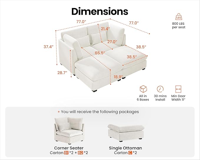 - 【Shipped in Six Packages for Easy Setup】To enhance your convenience, the sectional will be delivered in six packages, allowing for easier handling and assembly. Each package is carefully packed to ensure safety during transit, and while they may arrive at different days, rest assured that our professional customer service is ready to assist you with any concern. The thoughtful design makes the setup process simpler and more efficient,ensuring you enjoy your sectional without any hassle