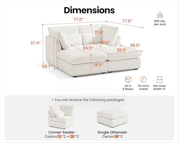 - 【Shipped in Six Packages for Easy Setup】To enhance your convenience, the sectional will be delivered in six packages, allowing for easier handling and assembly. Each package is carefully packed to ensure safety during transit, and while they may arrive at different days, rest assured that our professional customer service is ready to assist you with any concern. The thoughtful design makes the setup process simpler and more efficient,ensuring you enjoy your sectional without any hassle