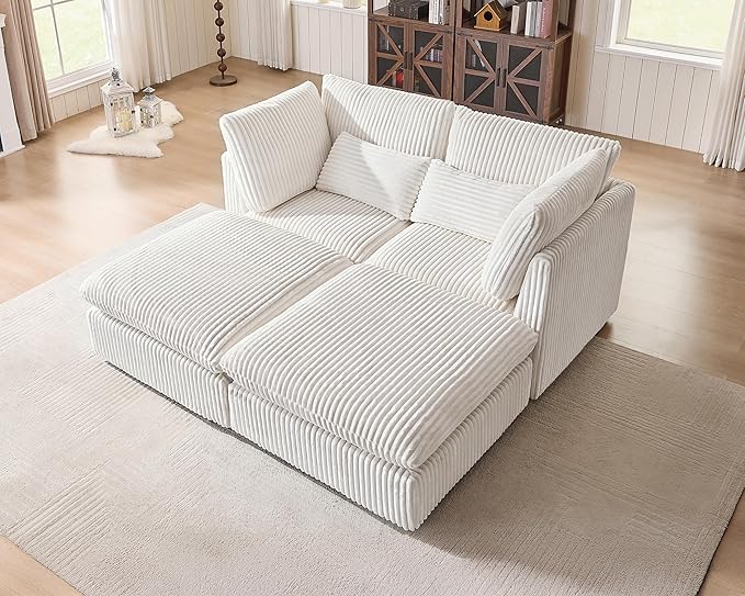 Oversized Modular Sofa, Extra Deep Cloud Corduroy Sectional Couch with Ottoman Chaise, Fluffy Corduroy 4 Seater Couch Bed for Living Room, Villa (Sofa Bed 4 Seater, Corduroy White)
