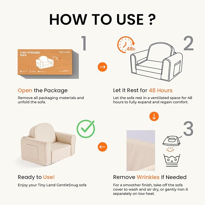 - No Installation, Easy to Use: The Tiny Land kids foldable sofa is fully functional right out of the box—no complicated setup required! Simply unfold the sofa for instant comfort, and it’s ready for use. For optimal comfort, we recommend allowing 24 hours for the sofa to fully expand to its best shape. When it’s time to tidy up, simply fold it back up for easy storage