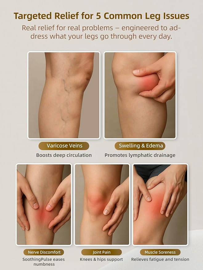 - All-in-One Varicose Veins Treatment for Legs – Combines SoothingPulse, vibration, light, and soothing heat therapy to actively boost circulation, relieve varicose veins, and reduce swelling, heaviness, and discomfort in legs and feet. Works as a powerful leg massager and heated foot massager for daily care.