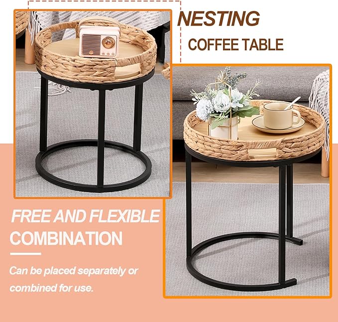 Nesting Coffee Table, Small Round Stacking Side Table with Metal Frame, Modern End Table for Living Room Bedroom Office Balcony (Rattan, 1)