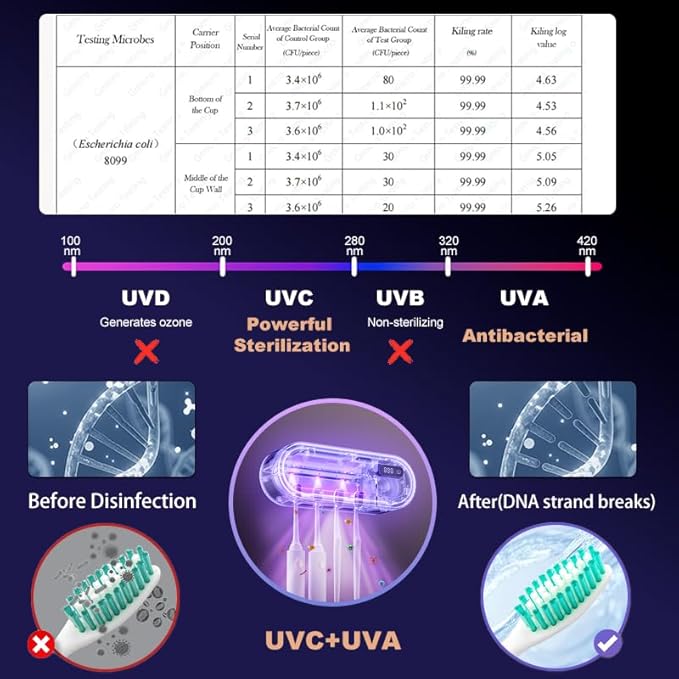 - ✅【High-Efficiency Cleaning】Our UV toothbrush sanitizer utilizes advanced UV light technology, achieving a cleaning rate of up to 99%, ensuring your toothbrush stays in optimal condition. Enjoy every brushing session with confidence, safeguarding your family's oral health.