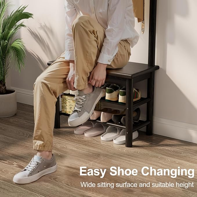 - [3-in-1 Coat Rack] Our hall tree combines three functions in one: hooks for coats and bags, a shoe bench for changing shoes, and a shoe rack to organize your footwear—this freestanding coat rack brings you a tidy, convenient, and cozy entryway at home