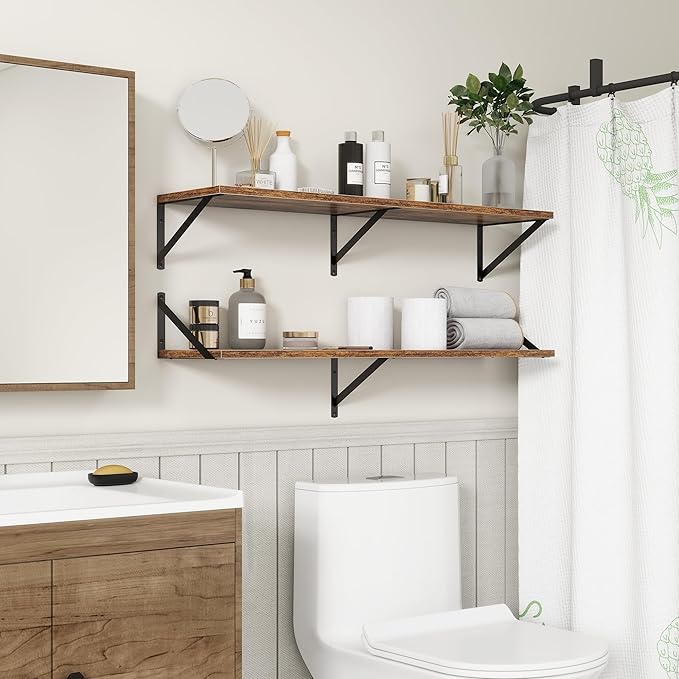 - 【FARMHOUSE RUSTIC WALL SHELF】These floating shelves are made of premium engineered wood board and visible triangular bracket. The rustic wooden grain surface add character and warmth to any modern or traditional interior with these deep floating shelves, contrast shelves at staggering heights on the wall or mount side-by-side or in the corner for a clean streamlined look.