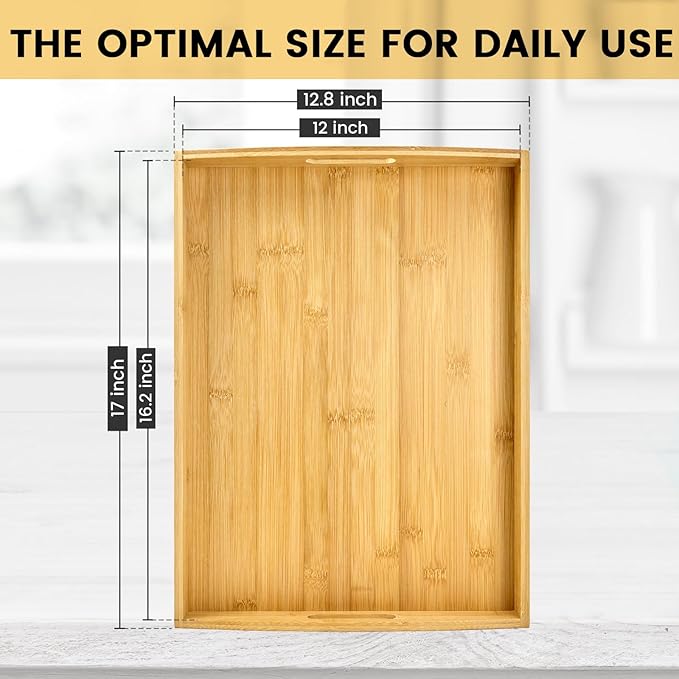 - SERVING TRAY WITH HANDLES : Our bamboo serving tray features a 1.5-inch edge height, crafted for durability and stability. It comes with two sturdy, ergonomic curved handles and raised edges, which prevent items from falling and allow for effortless transport of food and drinks