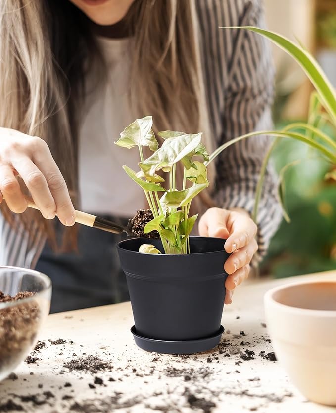 homenote Plant Pots,6/7.5 Inch Flower Pots for Plants Plastic Planters for Indoor with Multiple Drainage Holes and Trays, for All Home Garden Flowers Succulents,Outdoor(Black,10 Pack)