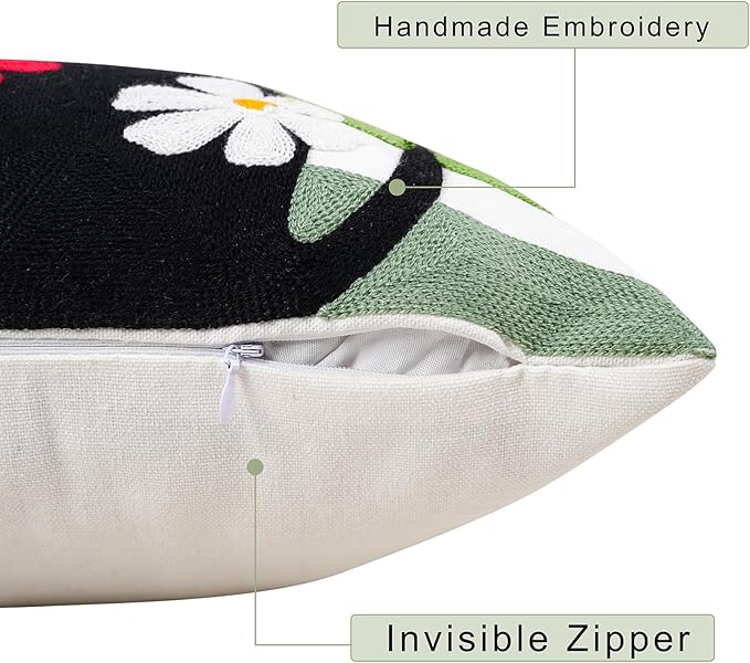 Merrycolor Embroidered Pillow Covers 18x18 Black Cat and Flower Pattern Halloween Decorative Throw Pillow Covers Comfortable Cotton Canvas Square Couch Cushion Cases for Sofa Bed Living Room Decor