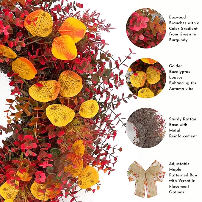 - Weatherproof: Crafted with premium weatherproof plastic, this large 24'' wreaths for front door withstands harsh outdoor elements from late summer to winter. Featuring fade-resistant foliage and reinforced frame, it maintains vibrant autumn hues through rain, snow and UV exposure - ideal for year-round porch or garden display.