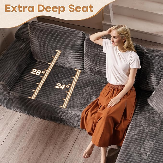 Cloud Sectional Couches for Living Room,U Shaped Modular Sofas No Assembly,135x100 Inches Plush Corduroy Oversized Floor Couch Set with Deep Seat Chaise,Grey