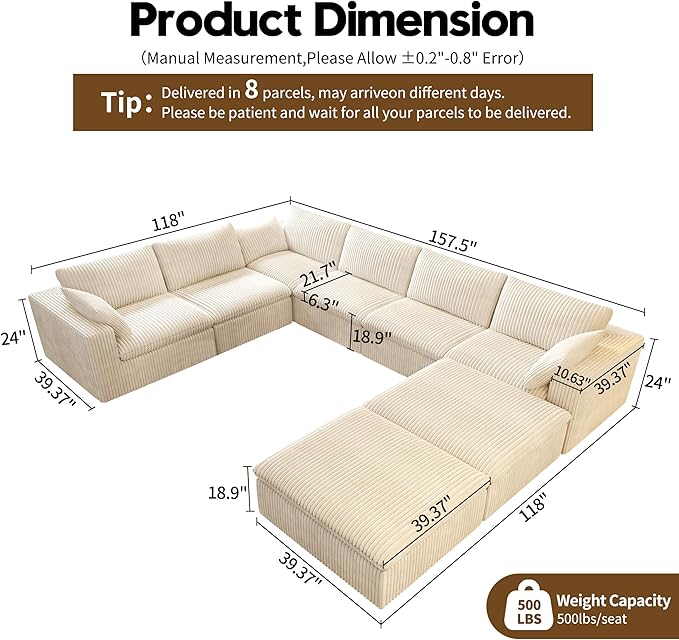 - Tips: 8 Boxes Packaging and sometimes they arrive at different times.Due to the sponge rebound, when just unpacked, the size may deviate from the picture size, after 72 hours of resting, the product size will be restored to the size of the picture If you have any questions about your cloud couch or need assistance, please reach out to us as soon as possible.