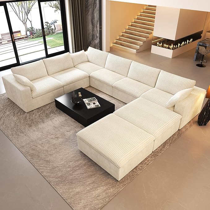 Oversized Modular Sectional Cloud Couch,157.5" U Shaped Modern Sofa with 2 Ottoman and 2 Middle Seats,Upholstered Couches with Corduroy Fabric for Living Room Furniture,No Assembly Required,White