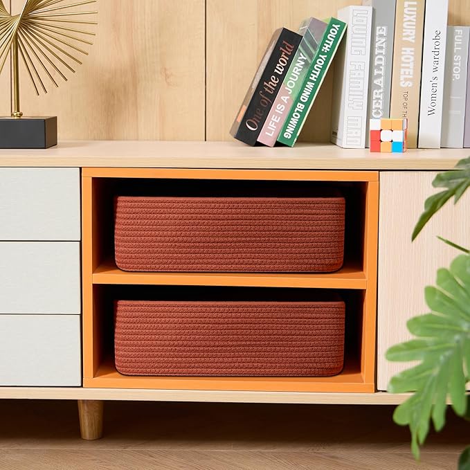Large Shallow Organizing Baskets 15x11x5.1 Inches - Rope Woven Storage Bins for Bathroom, Shelves, Cube Closet, Red 2 Packs