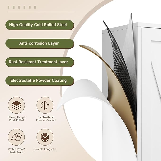 - Durable & Stylish: Made from high-quality materials, this metal cabinet offers long-lasting reliability with a 150 lbs per shelf and 750 lbs total capacity. Its 0.89 mm thick sheets combine practicality and timeless design, making it a perfect investment for any home