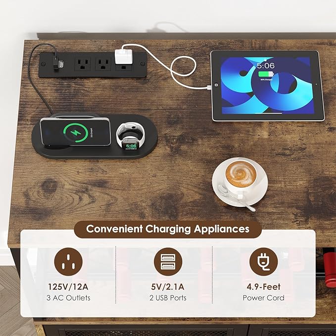 Wine Bar Cabinet with Wheels, 4-Tier Bar Cart with Power Outlets and LED Light, Liquor Cabinet Home Mini Bar with Wine Rack, Coffee Bar Cabinet for Liquor, Rustic Brown