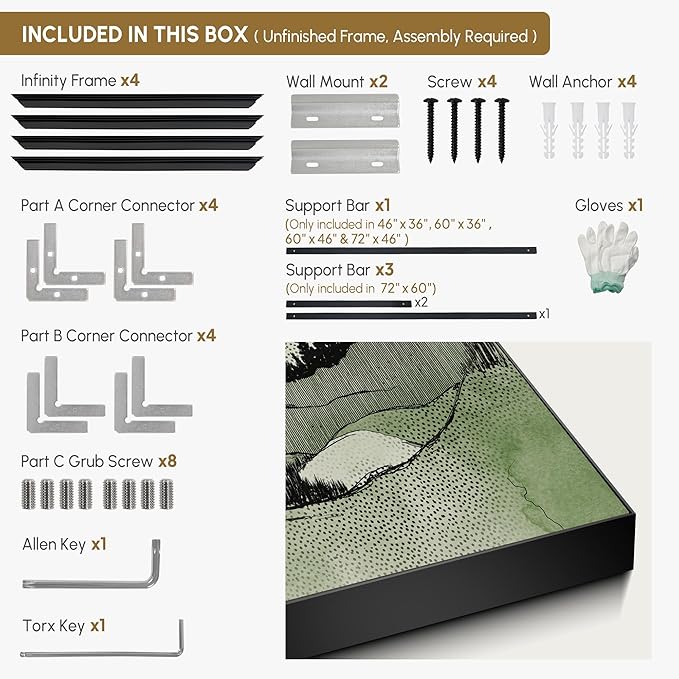 - Assembly Required: The artwork comes with the frame components unassembled. Don¡¯t worry - setup is straightforward and tool-friendly. For best results and accurate alignment, we recommend two people to ensure a smooth assembly and a stable, secure wall mount.