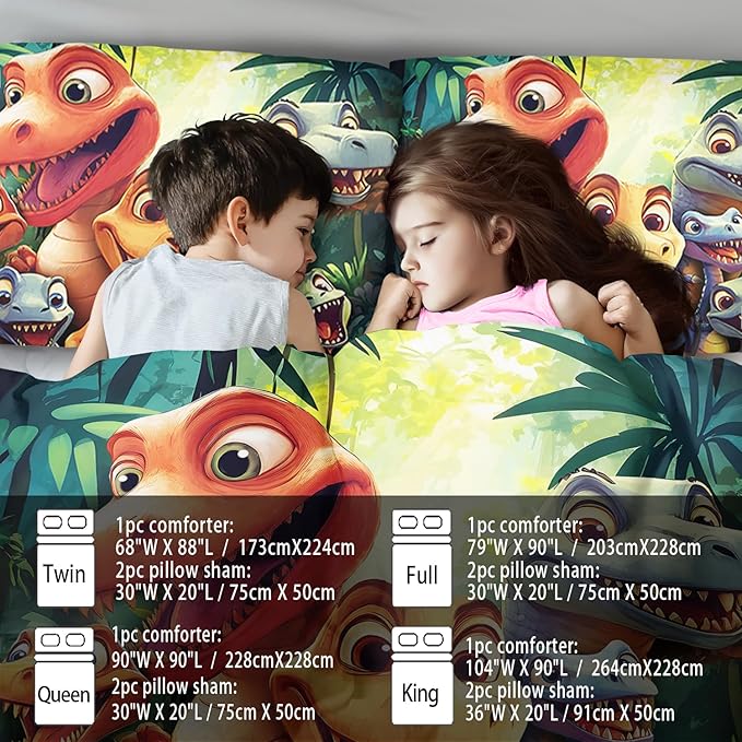 - Twin Size Dinosaur Comforter Set :This bedding set includes 1 comforter(67" x 85") and 2 pillowcases(20”x30”). In order to facilitate transportation, the quilt is made of vacuum compression technology. It will be slightly wrinkled when taken apart, but it will quickly regain its fluffiness if you gently beat it.