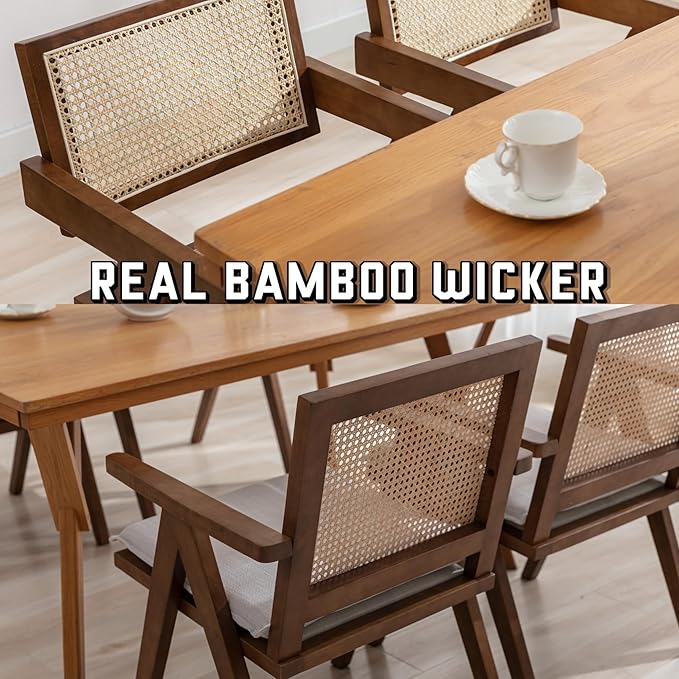 Rattan Dining Chairs Set of 4, Farmhouse Wicker Dining Chairs with Removable Linen Cushion Accent Cane Armchair for Dining Room Kitchen Restaurant, Walnut