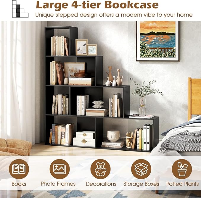 Tangkula 4-Tier Stepped Bookshelf, Freestanding 6 Cubes Ladder Bookcase with Anti-Tipping Kits, 64" Tall Modern Wooden Storage Display Rack for Home Office Living Room Study (2, Black)