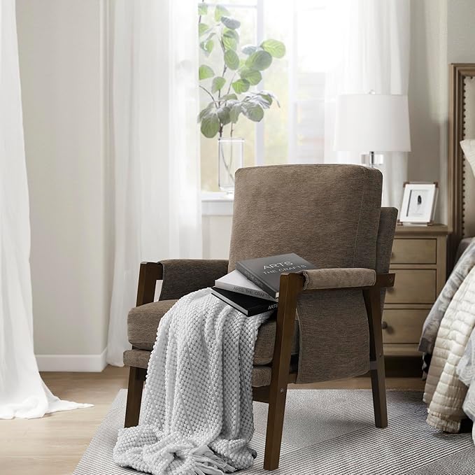 Modern Accent Chair for Living Room Mid Century Arm Chair Upholstered Bedroom Chair Comfy Lounge Chair with Solid Wood Frame, Dark Brown
