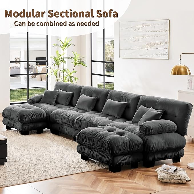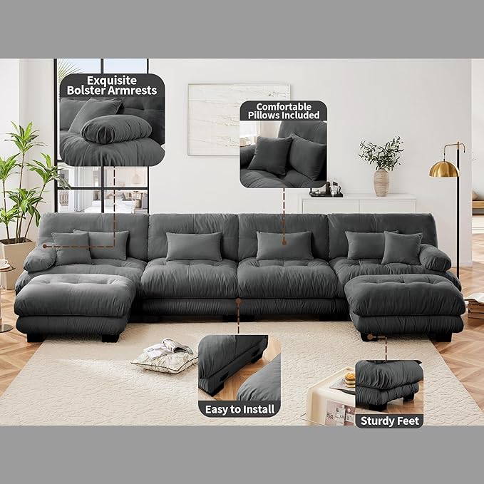 Modular Sectional Sofa U Shaped Sectional Couch, 4 Seater Cloud Couch with Ottoman, Modern Oversized Deep Seat Couches for Living Room, Comfy Chenille Sofa with 6 Throw Pillows, Gray