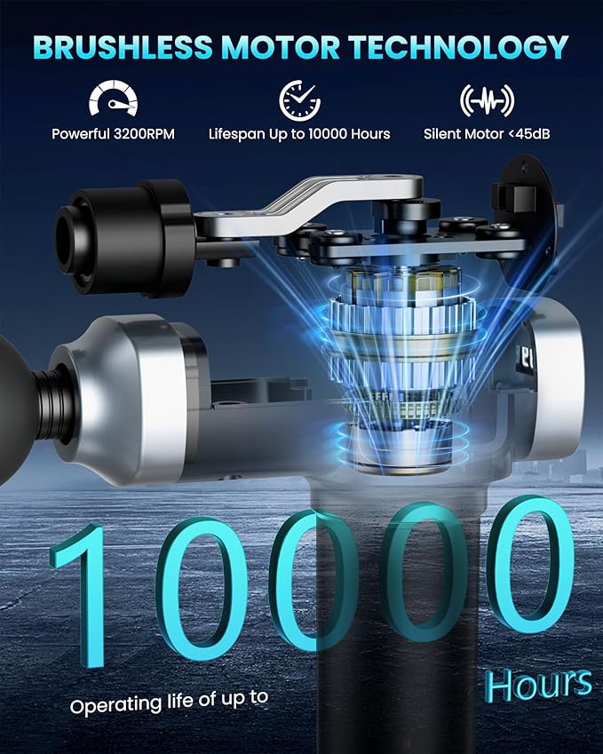 - 【Silent Strength, Built to Last】Equipped with a powerful brushless motor, percussion massage gun delivers up to 10,000 hours of long-lasting performance while operating quietly at less than 45 dB, allowing you to enjoy smooth and effective muscle relief at home, the gym, or the office