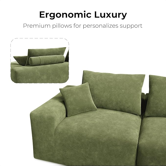 LIKIMIO 120" Modern L-Shaped Modular Sectional Sofa for Living Room, Corduroy Upholstery Green, Oversized 3-Seater Couch with Deep Seat and Movable Ottoman – No Assembly