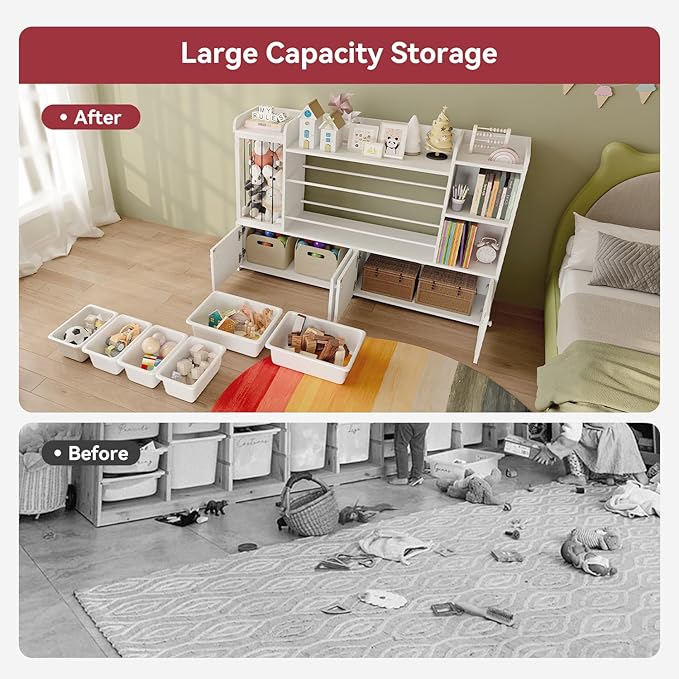 - Spacious 55-Inch Storage Solution: Multi-functional organizer with 8+ compartments combines open shelving for toy displays and closed cabinets for hidden storage, ideal for books, plush toys, and nursery essentials.