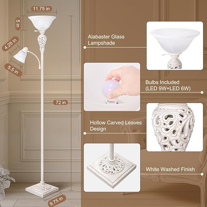 - Unique Design: The torchiere lamp features 2 white alabaster glass shades with a frosted texture, which looks more elegant and softens the light. The hollow carved leaves design and washed white finish of the lamp body add a vintage touch to your home.