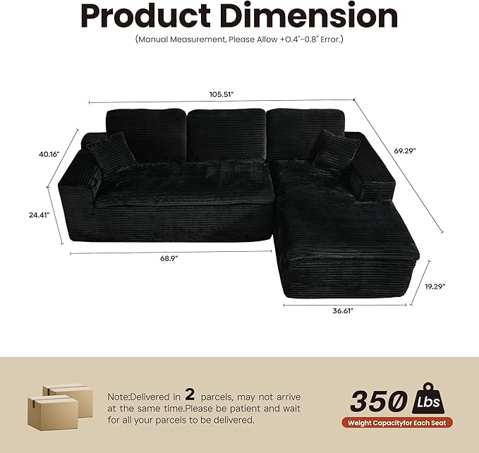 ovios 105” Modular Sectional Sofa with Thicken Seat Cushion, Cloud Couch with Deep Seat, Modern L-Shape Sofas Couches with Chaise,Upholstered Couches for Living Room Bedroom,Black