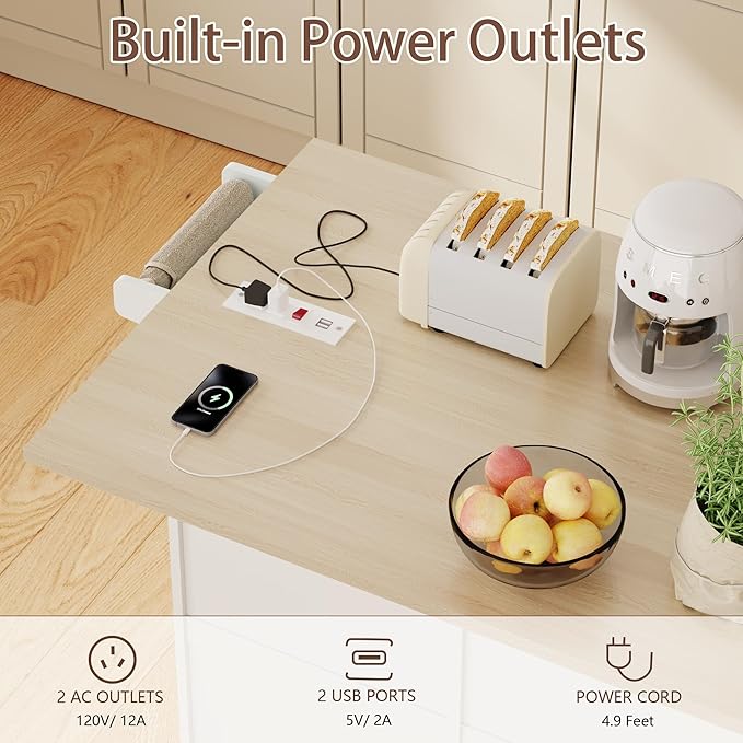 - Kitchen Island with Power Outlet: This kitchen carts on wheels is equipped with a 4.9ft cord, 2 AC outlets, and 2 USB ports; this kitchen island with storage provides easy access to power. Effortlessly charge or operate appliances like coffee makers, microwaves, or toasters right at the cart, enhancing cooking convenience.