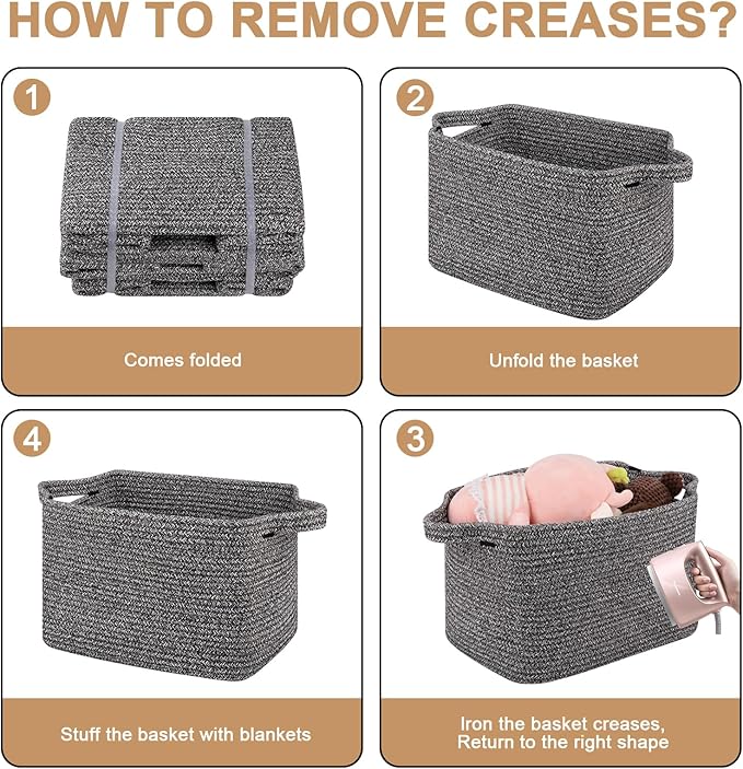 - NOTE: The home woven storage basket is folded when shipping, it will turn back to its elegant shape quickly when you fill in some towels or clothing , and also iron is a good idea