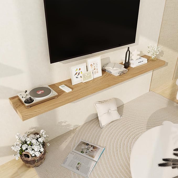 - 【12 INCH DEEP FLOATING SHELF】This extra deeper and thicker wall shelves are 12 inches in depth and 2 inches in thickness instead of the regular narrow floating shelves, you can put photos, pictures, DVD players, videos, books, toys, and some other knickknack on this beautiful display wooden shelf.
