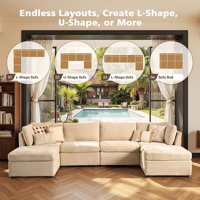 Modular Sectional Sofa, 130.7 Inch U Shaped Couch Set for Living Room, 4-Seater Comfy Cloud Couches with Two Movable Ottoman, DIY Combination, Plush Corduroy, Beige