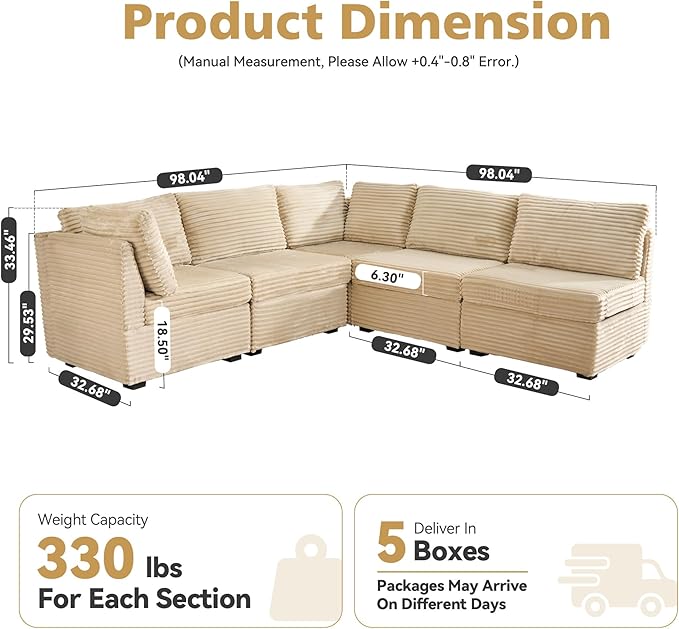 - One Package Per Seat:The modular sofa comes with 5 boxes and may arrive at different dates. Each box is designed and packaged to maximize shipping efficiency and fits narrow staircase and elevator. Armchair Size: 32.7" W x 28" D x 33.5" H; Ottoman Size: 32.7" W x 32.7" D x 18.5" H. Weight Capacity: 330 lbs / Seat. There may be slight color differences due to light or monitor.
