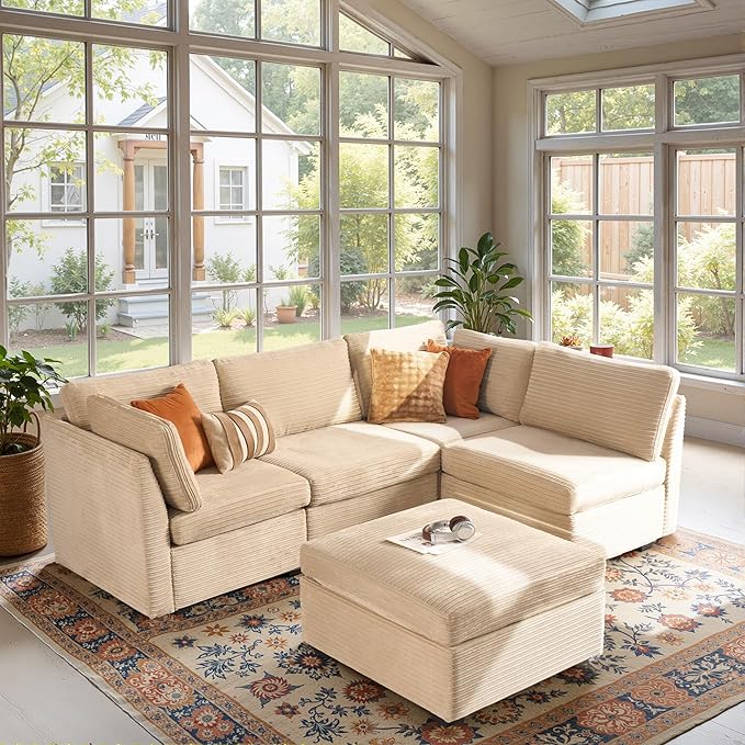 Modular Sectional Sofa, 130.7" L Shaped Couch Set for Living Room, 4-Seater Comfy Cloud Couches with Movable Ottoman, DIY Combination, Plush Corduroy, Beige