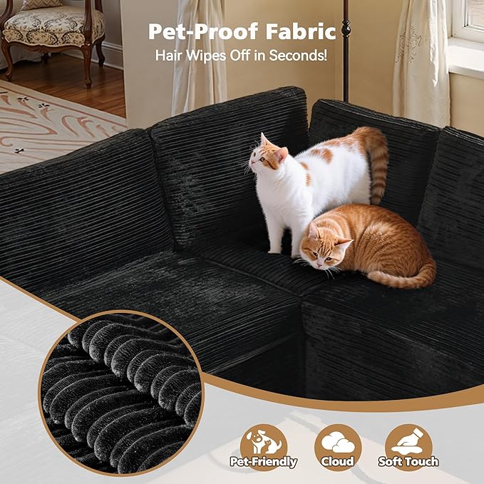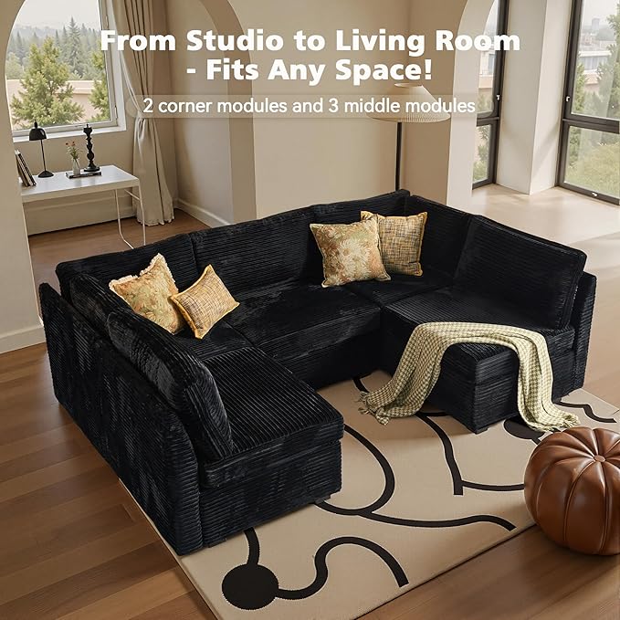Modular Sectional Sofa with Chaise U Shaped Sectional Couch for Living Room, 5-Seater Comfy Cloud Couches, Plush Corduroy, Black