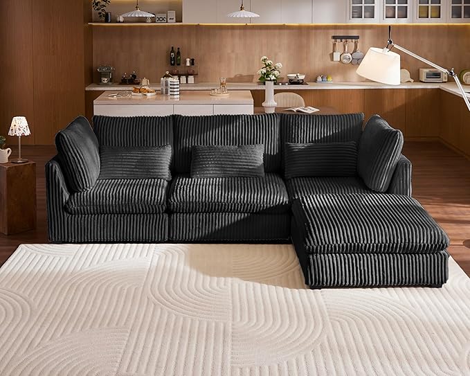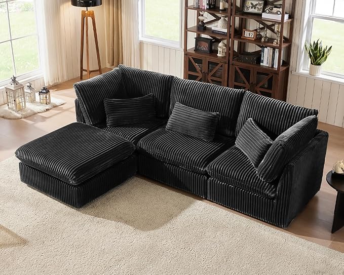 Oversized Modular Sofa, Extra Deep Cloud Corduroy Sectional Couch with Ottoman Chaise, Fluffy Chenille L-Shaped Sofas for Living Room, Villa (L Shape 4 Seater, Corduroy Black)