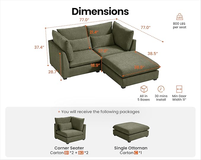 - 【Shipped in multiple Packages for Easy Setup】To enhance your convenience, the sectional will be delivered in multiple packages, allowing for easier handling and assembly. Each package is carefully packed to ensure safety during transit, and while they may arrive at different days, rest assured that our professional customer service is ready to assist you with any concern. The thoughtful design makes the setup process simpler and more efficient,ensuring you enjoy your sectional without any hassle