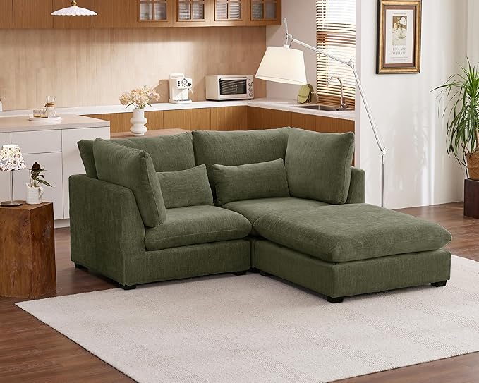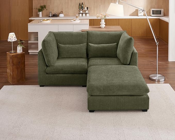 Oversized Modular Sofa, Extra Deep Cloud Corduroy Sectional Couch with Ottoman Chaise, Fluffy Chenille L-Shaped Sofas for Living Room, Villa (Loveseat+Ottoman, Chenille Green)