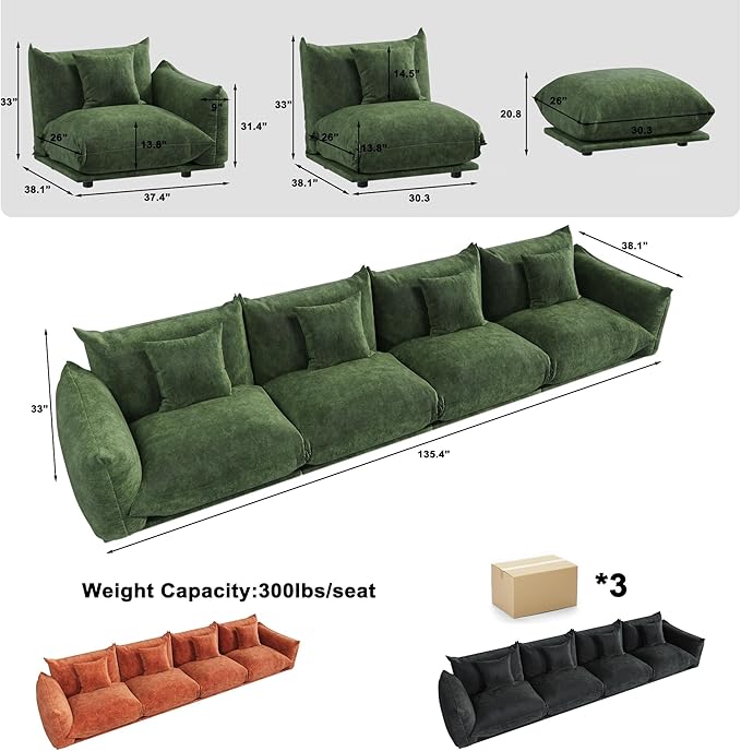 smilesun Modern Minimalist Chenille Modular Sectional Sofa, Oversized Couch and Loveseat Set with Thick Cushions, Upholstered Sofa for Living Room, Bedroom, Office, Apartment(Green,136" 4-Seater)