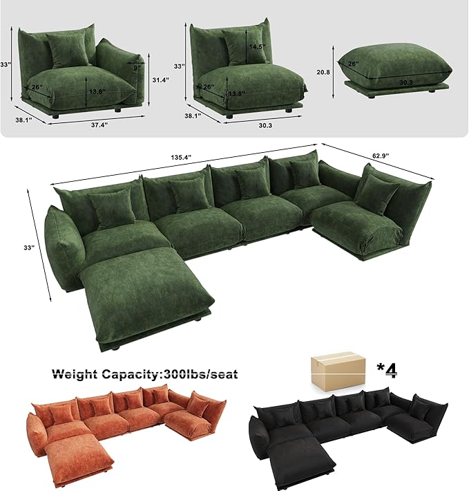 - 【Modular Design & Creative Color Blocking】This modular sofa includes armless seats, corner pieces, and ottomans that can be arranged to fit your space. Seats, backrests, armrests, and cushions can all be freely combined. With three color options, you can create bold color blocking and a personalized look. Depending on your needs, it can be configured into a loveseat, L-shaped sofa, U-shaped sofa, or even a sleeper sectional sofa—perfect for any space or lifestyle.