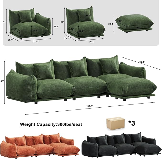 - 【Modular Design & Creative Color Blocking】This modular sofa includes armless seats, corner pieces, and ottomans that can be arranged to fit your space. Seats, backrests, armrests, and cushions can all be freely combined. With three color options, you can create bold color blocking and a personalized look. Depending on your needs, it can be configured into a loveseat, L-shaped sofa, U-shaped sofa, or even a sleeper sectional sofa—perfect for any space or lifestyle.