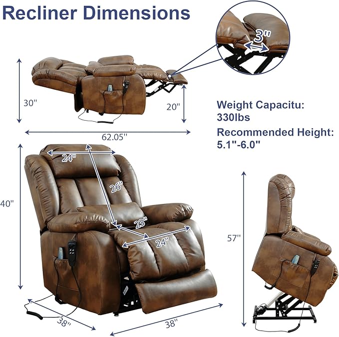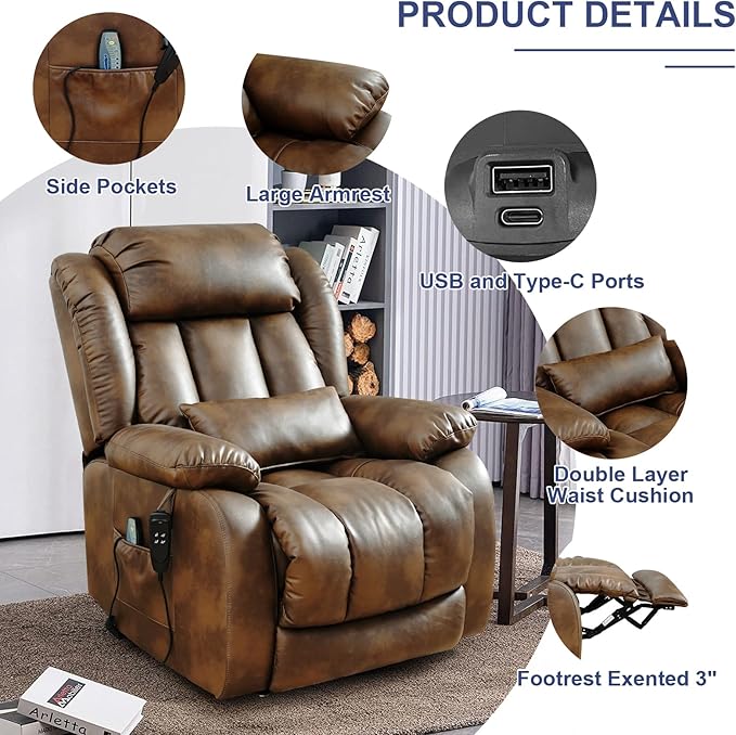 - [Upgraded Size] Our power lift recliner has a longer footrest and thicker backrest with double lumbar cushion design, which can provide you with a more comfortable using experience. In addition, the footrest has been extended by 3", which can more fully support your feet when you recline in the chair to read or rest, allowing you to get a more ultimate experience.